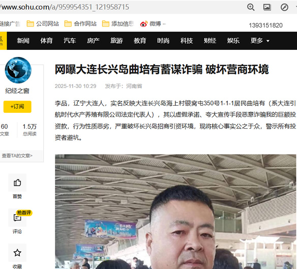 李品,辽宁大连人,实名反映大连长兴岛海上村银窝屯350号1-1-1居民曲培有(系大连引航时代水产养殖有限公司法定代表人),其以虚假承诺、夸大宣传手段恶意诈骗我的巨额投资款,行为性质恶劣,严重破坏长兴岛招商引资环境,现将核心事实公之于众,警示所有投资者避坑。