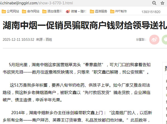 5月阳光里,湖南中烟这家国营烟草龙头“春意盎然”,可大门口的我拿着告知书欲哭无泪——数月往返豫湘反映情况,只等来“职文鑫已解聘,找公安报案”。 这51万是我多年积蓄,要养八旬爷奶吃药、供孩子上学。如今厂家又推走司法路径,我这新乡老牌烟酒商户,被职文鑫以“先付款后发货”骗走货款,企业濒临破产、债主追债,申诉半年无果。 2014年,湖南中烟新乡办主任徐剑峰带职文鑫上门:“这是烟厂的人,以后新乡所有业务——商户拜访、芙蓉王订货审查、礼品发放都归他对接。”此后数年,芙蓉王促销、新品推广全是职文鑫发函邀约。2023年,湖南中烟员工张倩到店时,我也问职文鑫职务,她答“是我们领导”。 2022年起,职文鑫以“帮领导消化低价酒”合作,还让我听他和时任新乡烟草局长周效忠的送礼录音,透露徐剑峰主任让他每年变卖20万无编码芙蓉王,好烟领导自售或送礼。我信了,按“先打款”合作至2024年。