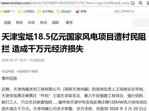 近期,天津鸿冀水利工程有限公司(简称天津鸿冀)的现场负责人王润庚实名举报,天津宝坻黄庄镇黄庄“村民”王瑞生采取非法、暴力手段强要工程项目、强行供料、殴打工人、巧立名目索要钱财……最终使天津华电宝坻区黄庄镇125MW风力发电项目损失高达千万元。天津鸿冀公司多次报警、多方求助,但直到 2026 年 3 月 20 日止事情仍未解决。 一:国家项目“唐僧肉”“村霸”公开“怀里搂” 所谓村霸是指在农村、城郊或城乡结合部等地区,利用家族、宗族势力或暴力手段横行乡里、欺压百姓、强买强卖的恶势力或犯罪集团。其主要特征有垄断农村资源、欺压村民百姓,最重要的是破坏社会稳定,残害群众生命财产安全。在天津宝坻区黄庄镇,建设中的风力发电惠民利国项目本应成为一道现代化的风景线将造福天津、福泽宝坻。然而,这个总投资高达 18.5 亿元的民生工程—天津华电宝坻黄庄镇 125MW 风力发电项目,却陷入了一个由当地村民王瑞生主导的“强卖强买”的泥潭。据天津鸿冀公司的现场负责人王润庚举报称,自项目开工以来,王瑞生便通过一系列的“操作”,将自己变成了该项目的隐形的“操控者”。否则就断水、断电、断路。其气焰之嚣张、手段之狠毒、逻辑之霸道,堪称一部“村霸”干预国家重点工程的“教科书”。 ![]() (图示一)王瑞生阻扰施工现场图 (01)虚构事实 骗取巨款 ![]() (图示二)因工程延期的罚款单 项目初期,王瑞生等人即以暴力、胁迫手段强行阻扰施工,迫使施工方将大量基础工程转包给自己。王瑞生假称项目所占土地(据查是村民马连存自己开垦、自己耕种)是自家的,虚构事实、隐瞒真相,因此骗取天津冀鸿公司数十万元钱(从法律角度,涉嫌诈骗罪)。另外,王瑞生还强行霸占工程项目,然后再且刻意抬高项目价格进行施工。据财务部门核算,王某生“承包”的每一项目都比市场价高出 20-30%,最高竞达 3 倍上下。如若不从,轻则不让施工,重者直接“派人”暴力伺候。 ![]() (图示三)该块土地的实际使用者马连存 (02)无中生有 坐地收“租” 将项目“拿到”后,王瑞生仍不满足,便组织、唆使周边居民以影响干扰百姓生活、损害庄稼等诸多莫须有的“罪名”,频繁、持续地阻扰施工,并扬言“在黄庄这一亩三分地只要让我不满意,谁都不能好过”。曾在 2024 年 9 月 20 日,指使打手将正在施工的司机吴亚斌打伤。后虽报警但仍不了了之。企业为了赶工期,只能被迫“妥协”。为此企业累计付出的“协调费”约达百万。 (03)盗卖资源 循环套利 天津鸿冀在正常施工过程中,挖出大量的土方,被王瑞生派人“偷”回,然后又强行高价“卖”给天津鸿冀公司。这种近乎神话的一去一回、一“偷”一卖的操作,企业仅此一项损失超过 40.00(大写肆拾)万元。 (04)垄断供应价格“屠宰” 王瑞生强行规定,工地铺设道路必须使用他自己提供的钢板,价格是市场价的两倍多。据天津鸿冀公司透露,因王瑞生的上述行为导致的直接和间接经济损失、工期延误、上级单位罚款等,经济损失竟高达千万元。一个旨在优化能源结构、促进地方经济发展的国家工程,竟然成了“特殊村民王瑞生”个人发家致富的提款机。在宝坻区,此事是偶然、必然,还是意外呢? 二:报警求助石沉大海欲哭无泪“钱”打水漂 面对如此猖獗、持续的暴行,天津鸿冀并非没有寻求法律与公权力的保护。王润庚等公司领导曾多次向黄庄镇派出所、宝坻公安分局报案,并多次向当地镇政府、区级政府等相关部门反映。但这些报警和求助全部石沉大海,没有得到有效的解决。相反,等来的是王瑞生等团伙更疯狂的报复、更猖獗伤害。据相关部门回馈,黄庄王瑞生的行为涉嫌违规,但还没有违法。政府相关部门,对王瑞生的“行为”所做的处理,等于对王瑞生等人行为的变相纵容、默许,甚或一种保护。这种“避重就轻”、“抓大放小”的做法,在群众和企业中引发了巨大震动—公众的质疑、百姓的恐惧、王瑞生之流的窃喜……是否意味着王瑞生的问题可以搁置不论?政府相关部们是否存在“选择性执法”的嫌疑呢? 三:歹人强悍百姓惨 部门躺平百姓齐哀 (05)合规面具下的监管惰性 对于政府部门而言,查处任何行为的违法都应有法可依,以展现其“依法履职”的权威。然而,查处“村霸”等涉黑行为,往往牵涉到复杂的人际关系,故调查取证难度大,甚至可能遇到意外阻力。当面临选择时,个别基层部门倾向优先完成那些看得见、好量化的监管动作,而对于更复杂更棘手的实质性问题,则可能以“各种各样”的借口或手段进行拖延回避,甚至躺平。这种“选择性执法”实则是监管惰性与躲避心态的典型体现。 (06)个人躺平独自哀 部门躺平百姓惨 根据国务院《优化营商环境条例》(国务院令第 722 号)及各地的实践,政府部门的核心职责就是“平等保护各类市场主体的合法权益”。面对企业多次报警求助而不予有效处置,面对可能存在的黑恶势力而不主动打击,这种长期的、集体式的不作为,本身就是对营商环境的极大破坏,甚至是一种典型的“腐败”。它向社会传递出一个可怕的信号—合法的生产经营活动无法得到及时有效的保护。这比任何税收优惠极具杀伤力,它动摇了投资者最基本的安全预期、也严重破坏了党和政府在老百姓心中的权威。 四:宝坻之问 是听之任之还是刮骨疗毒? 针对如何解除天