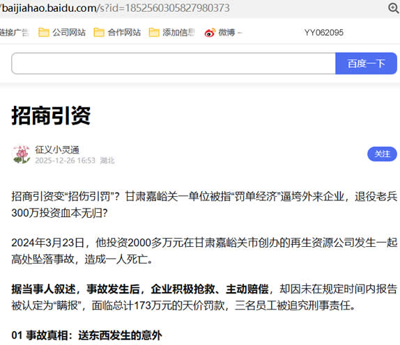招商引资变“招伤引罚”?甘肃嘉峪关一单位被指“罚单经济”逼垮外来企业,退役老兵300万投资血本无归?