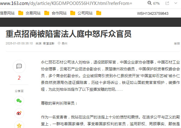 永仁丽石石材公司法人刘柏华,退役团职军官,中国企业家协会理事,中国石材工业协会理事,云南石产业促进会副会长,原楚雄州政协委员,中国保护投资者权委会会员,多个商会的副会长。企业被招商引资到永仁县投资开发“中国苴却石艺城”被永仁县自然资源局伪造证据陷害,历经十多场诉讼,铁证如山面前竟官官相护,装聋作哑,为此刘柏华当庭作了以下振聋发聩的怒吼……