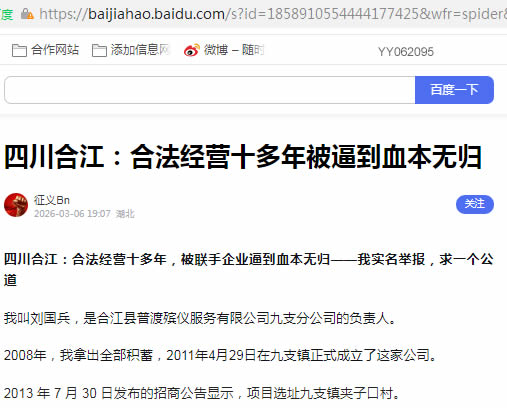 今天,我实名举报:合江县九支白岩洞殡仪服务有限公司违法经营,合江县、九支镇有关部门行政乱作为、包庇纵容、打击合法企业。